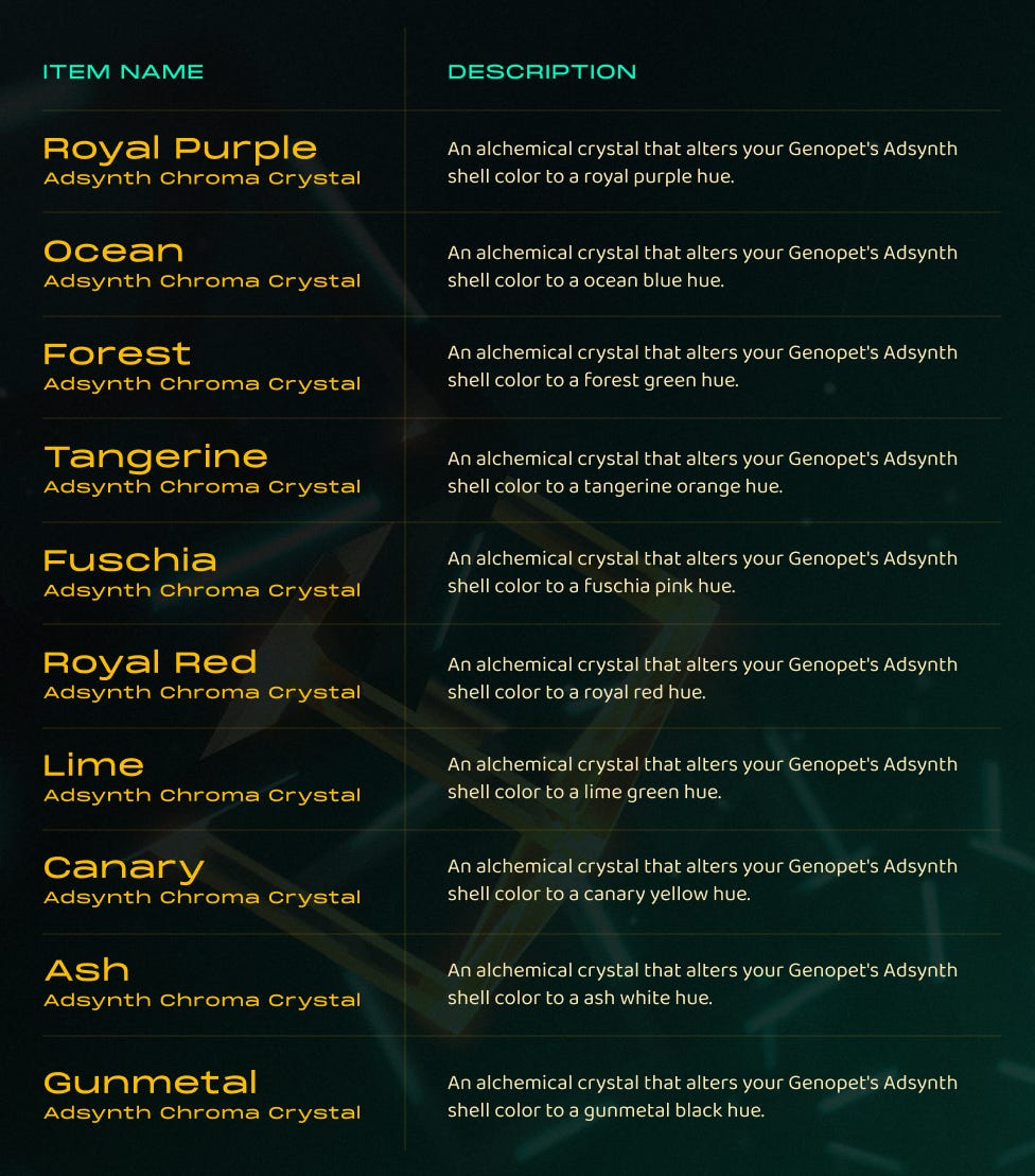 There are three different types of Chroma Crystals that will allow you to customize your Genopet’s coloration: Adsynth Chroma Crystals, Subsynth Chroma Crystals, and Lume Crystals.